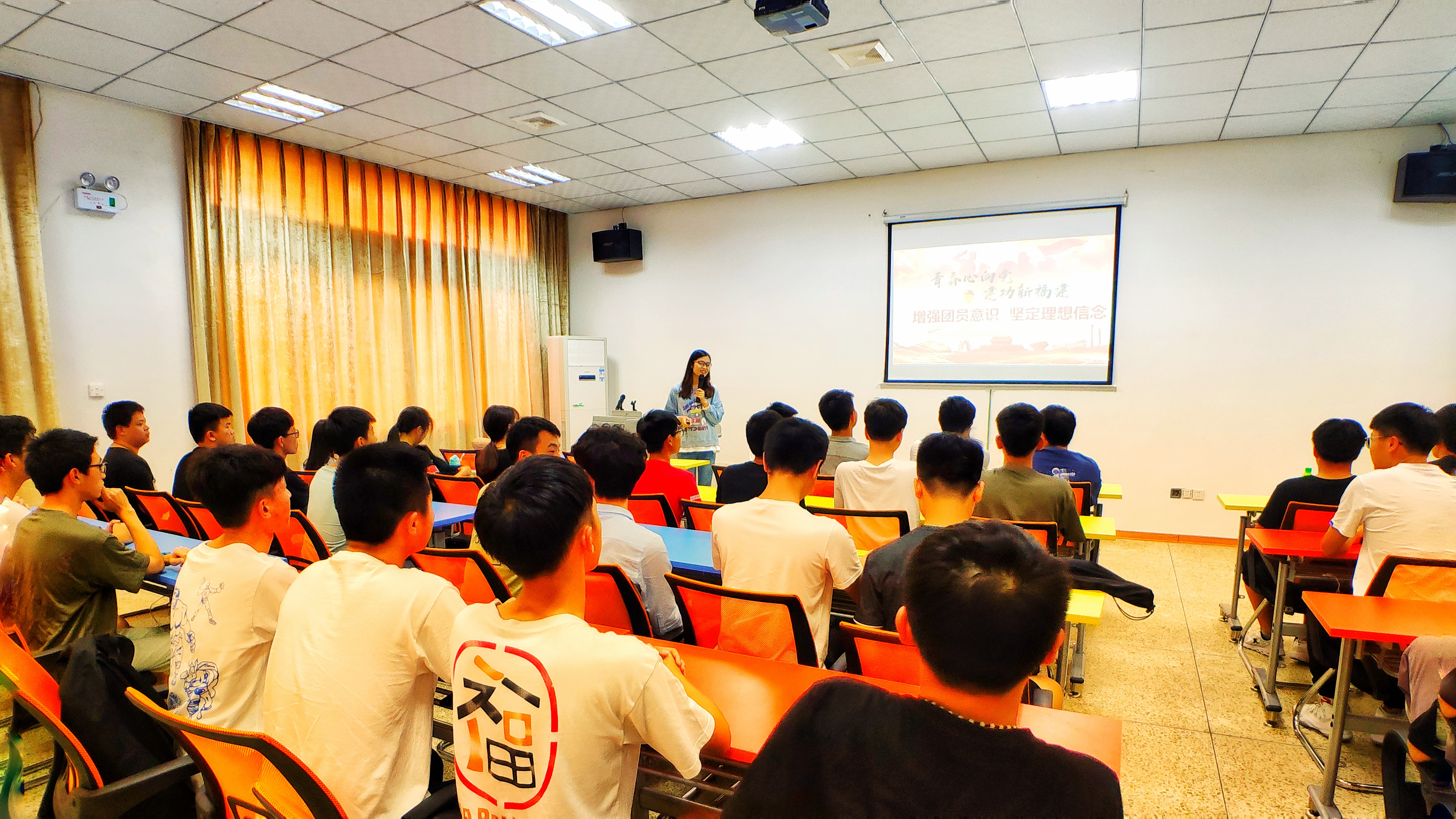 朱婷为全体团员讲述了“什么是团员意识”、“为什么要增强团员意识”、“增强团员意识的意义”、“如何增强团员意识”以及“理想信念的含义与特征”五个方面的内容,通过观看视频告诉团员们“理想信念的重要性”,以及如何成为一名优秀的共青团员,坚定了团员们的理想信念。宣讲结合着同学们的大学生活,内容形象生动,贴近团员实际,极大地引起了同学们的共鸣。
