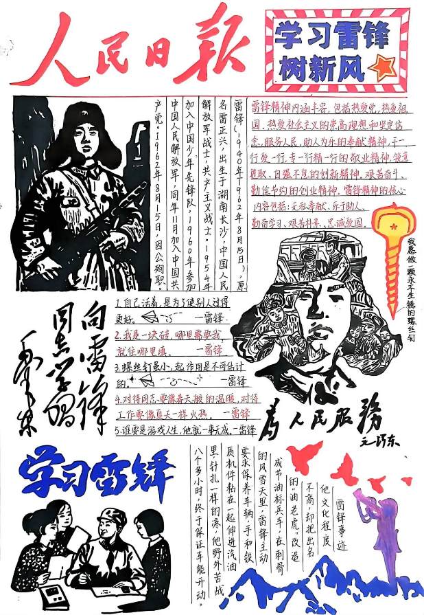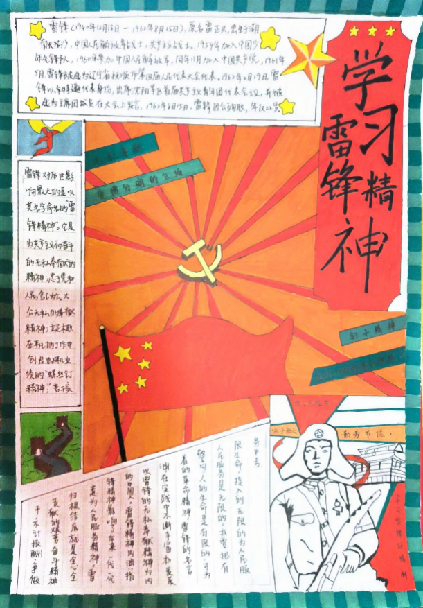 本次活动的开展激起了同学们的浓厚兴趣,紧紧围绕主题,通过绘画的形式,从各个方面宣扬雷锋精神:描绘雷锋肖像、雷锋事迹、摘录《雷锋日记》等,同学们用画笔分享雷锋的感人事迹,用文字诠释永恒的雷锋精神。通过此次活动,同学们更深刻地理解了雷锋精神的内涵,坚定了学习雷锋的信念,既传播了雷锋精神,又丰富了校园文明建设的内容,形成了浓厚的学雷锋氛围。