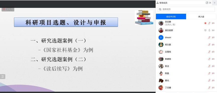 吴教授首先细致梳理了他个人的国家社科基金项目的申报经历,指出科研并非一蹴而就,需要用心沉淀、悉心打磨,鼓励师生在科研之路上多积累、多尝试。接着,吴教授详细地讲解了选题的几大来源:访学、阅读文献和学术会议。其中,旁征博引地说明了文献阅读的重要性,并分享了文献阅读的经典方法。最后,吴教授结合自己的国家社科基金课题,详细地介绍了科研项目的研究设计,深入浅出地分析了科研项目木申报书中主要部分的撰写方法。同时,根据自己的申报经历,吴教授为与会师生教师提供一些申报建议。在讲座后的交流环节,吴教授详细解答了与会教师的申报疑问,大家一致表示获益匪浅。