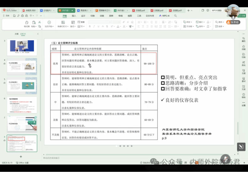 为保障答辩工作的顺利进行,英语系于5月13日召开了“2025届英语系本科生毕业论文答辩前说明会”。会上,英语系副主任张贵超老师详细讲解了论文答辩的要求和流程,明确注意事项,分享答辩技巧,耐心解答学生疑问,帮助大家调整心态、以最佳状态迎接答辩。随后,系里还召开了答辩秘书培训会,进一步明确工作流程和内容,强调答辩细节,保障答辩工作的有序进行。此外,在答辩前发布通知,邀请低年级学生观摩答辩,为学生提供宝贵的学习机会。